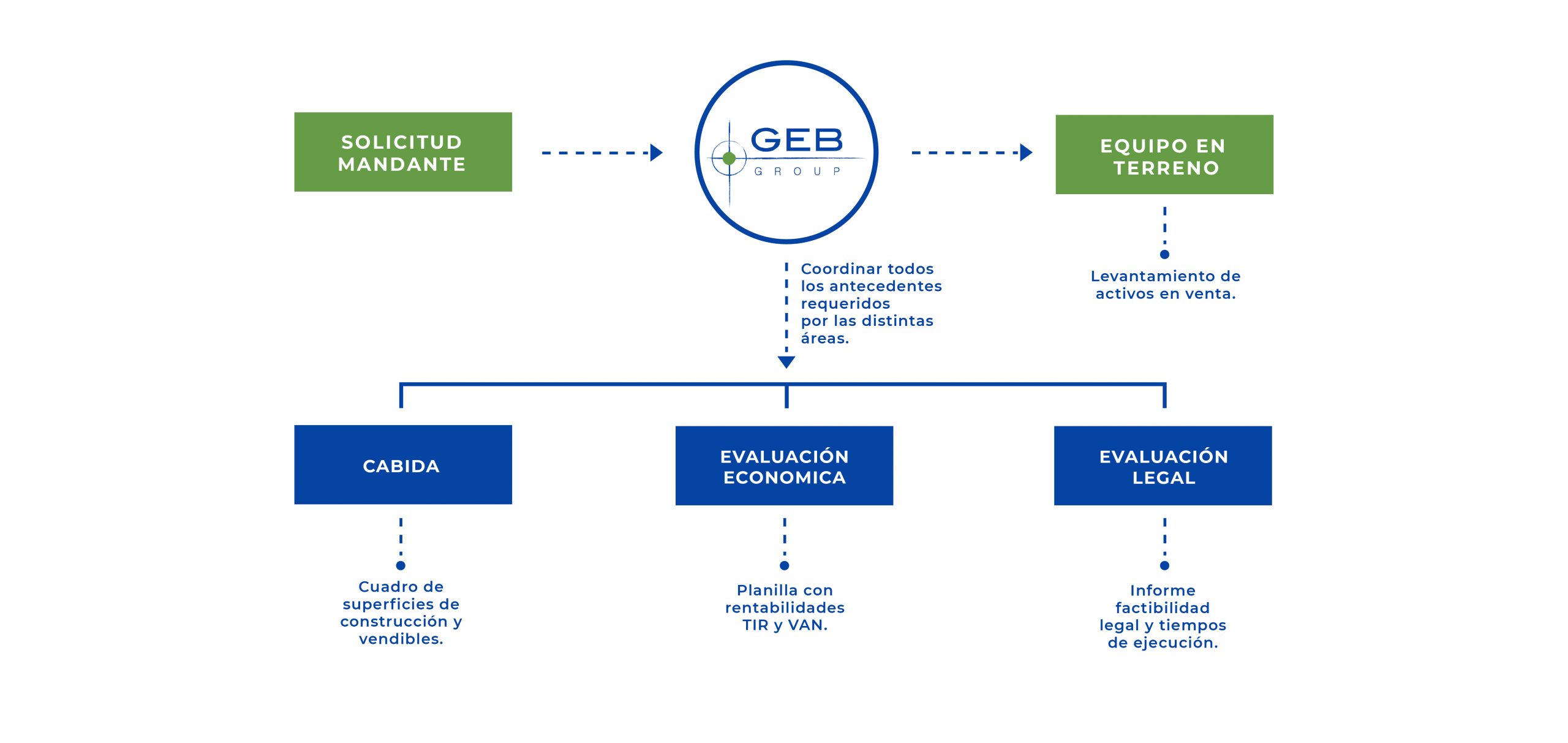 Detectar, buscar e identificar paños de terreno con aptitudes habitacionales, comerciales o mixtos, sobre los cuales sea factible desarrollar un proyecto inmobiliario que sea de interés del desarrollador, de acuerdo a los parámetros previamente definidos por el cliente. Contactar a los propietarios de los correspondientes lotes de terrenos, con el fin de indagar su disponibilidad para venderlos.